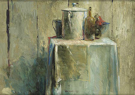 "Stilleven met emaille en rode accenten",acryl-papier op paneel,30x44cm.1991.